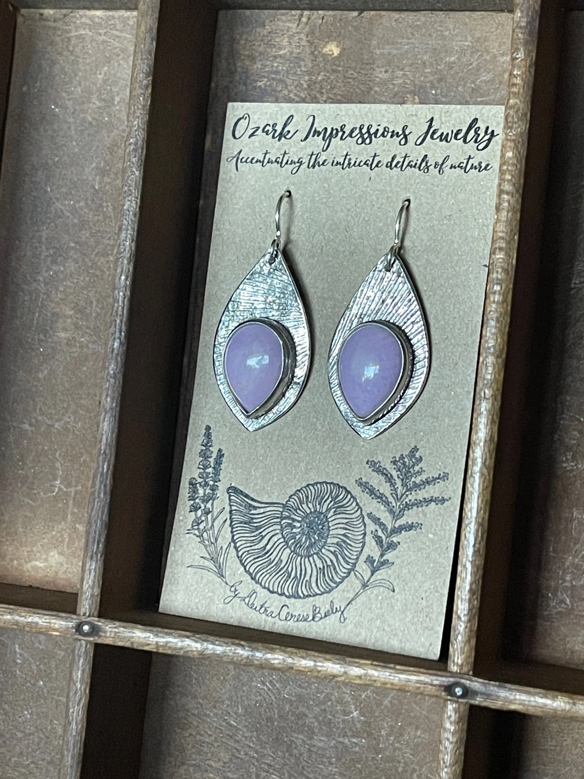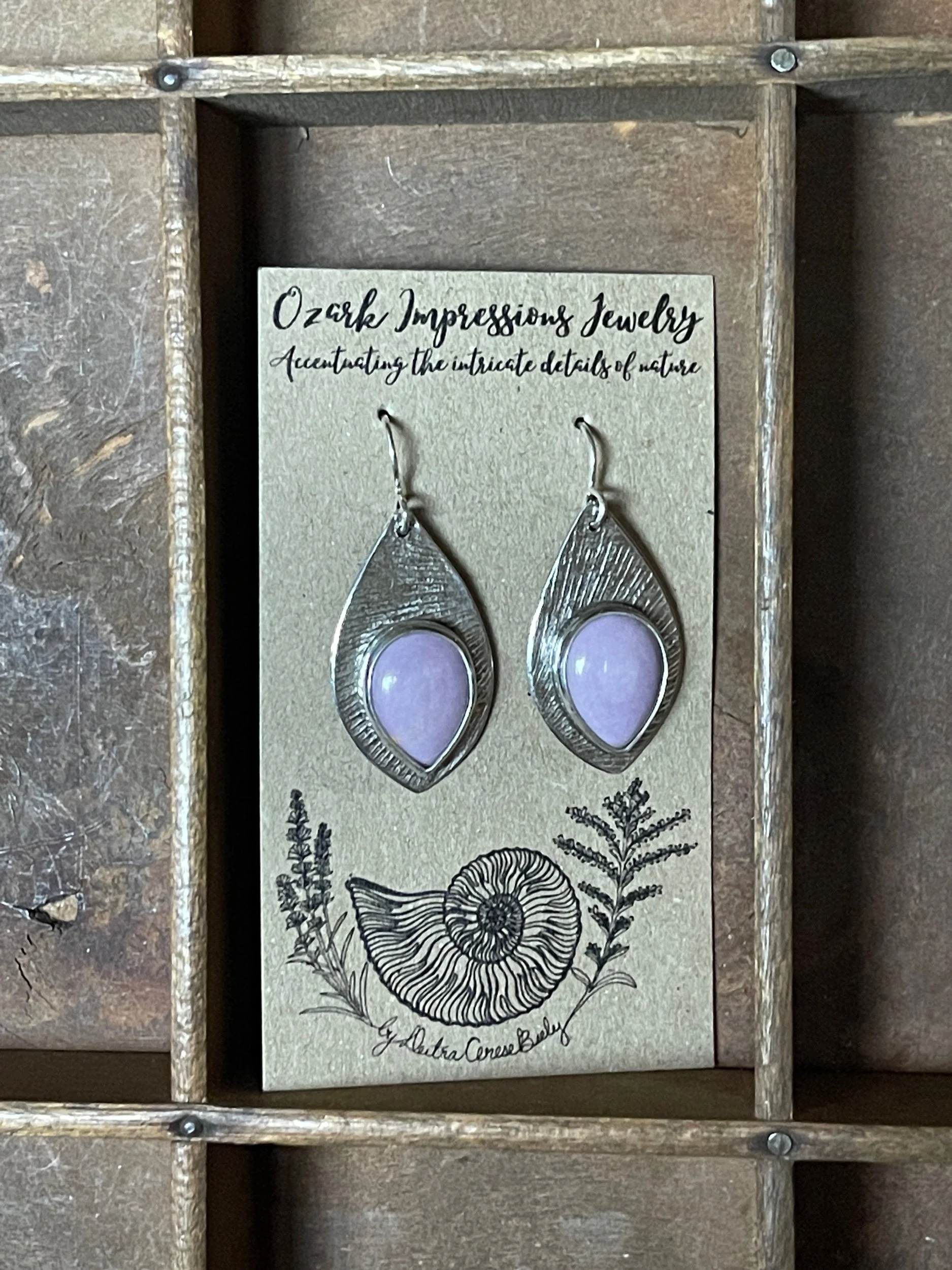 Each piece of Ozark Impressions Jewelry is impressed with nature findings from the Ozark Region where I grew up and continue to live. Every texture reminds me of a hike along an Ozark trail; a creek, river, or cave explored; or a sweet creature that shared these hills with me. I want the wearer to feel a bit of the magic and nostalgia I’ve felt exploring this place, and carry it with them wherever their journey takes them.