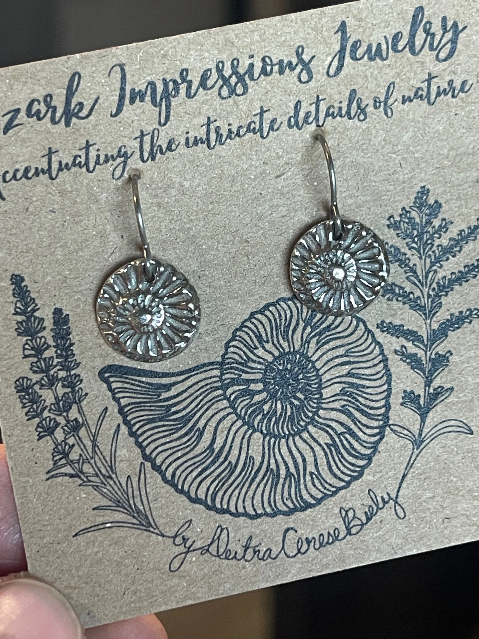 Ammonite Fossil impression earrings. Hypoallergenic Titanium ear wires. *Sterling silver wires available by request. Just make desire known in message at checkout.