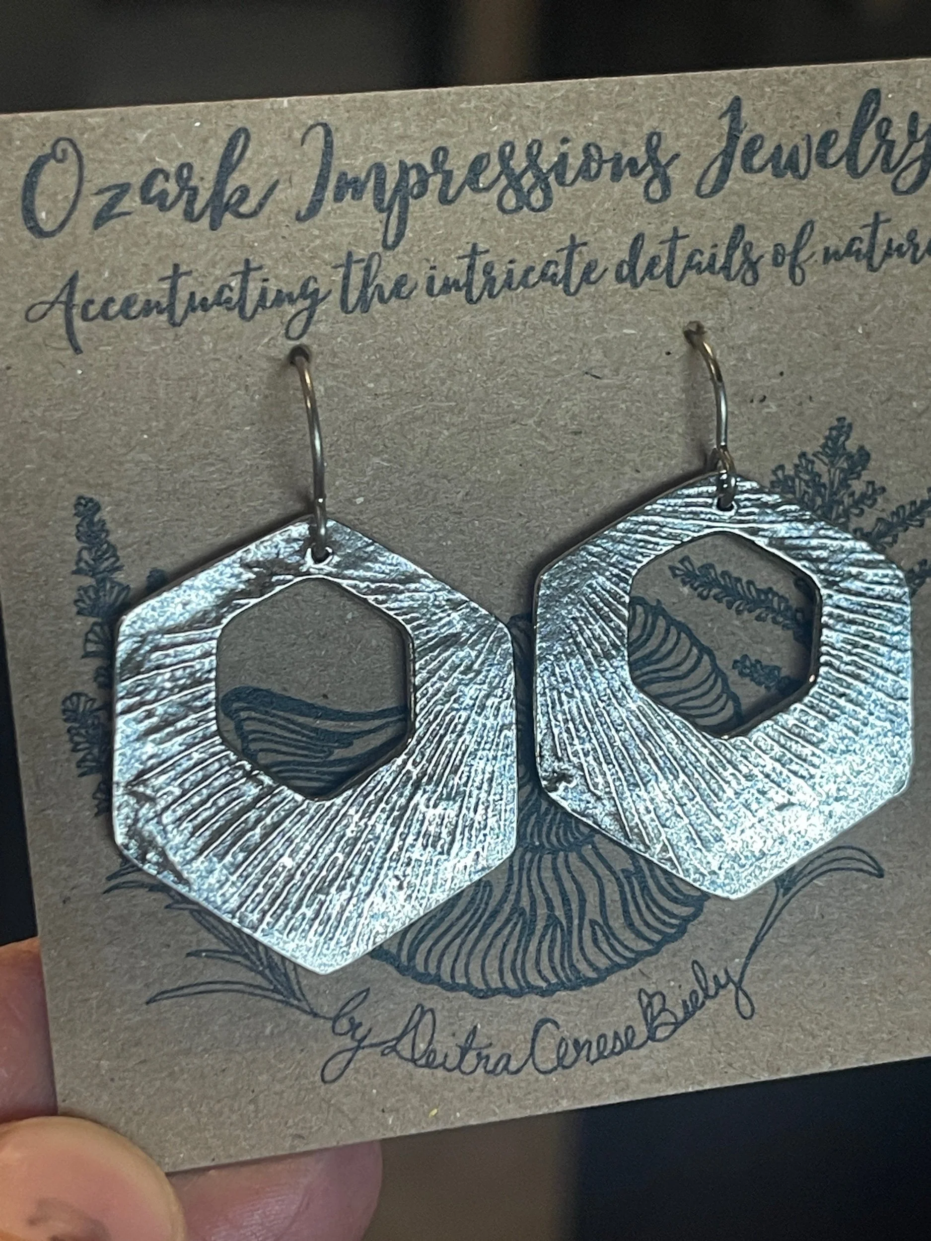 Ready to Ship ~ XL Open Hexagon Brachiopod Fossil Earrings - Fine Silver
